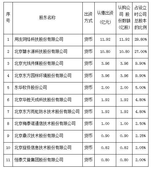 除碧水源外,其余十家企业分别为北京东方园林环境股份有限公司(以下简称“东方园林”)、用友网络科技股份有限公司(以下简称“用友网络”)、北京光线传媒股份有限公司(以下简称“光线传媒”)、东华软件股份公司(以下简称“东华软件”)、北京华胜天成科技股份有限公司(以下简称“华胜天成”)、北京东方雨虹防水技术股份有限公司(以下简称“东方雨虹”)、北京梅泰诺通信技术股份有限公司(以下简称“梅泰诺通信”)、北京鼎汉技术股份有限公司(以下简称“鼎汉技术”)、北京旋极信息技术股份有限公司(以下简称“旋极信息”)、恒泰艾普集团股份有限公司(以下简称“恒泰艾普”)。11家公司出资方式、认缴出资额、股权比例如下: