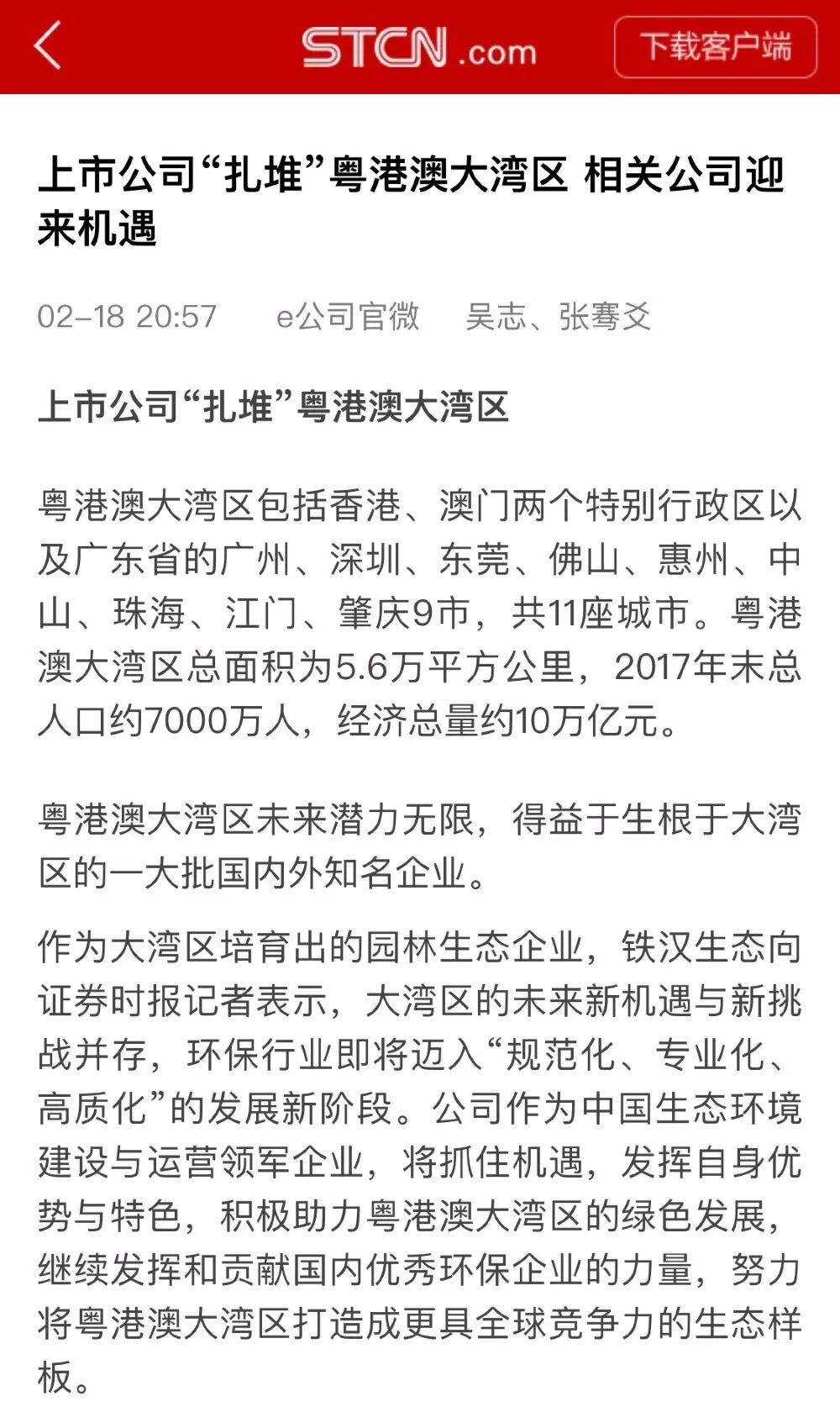 近日,中共中央、国务院印发《粤港澳大湾区发展规划纲要》,铁汉生态在接受《证券时报》采访时表示,大湾区的未来新机遇与新挑战并存,环保行业即将迈入“规范化、专业化、高质化”的发展新阶段。公司作为中国生态环境建设与运营领军企业,将抓住机遇,发挥自身优势与特色,积极助力粤港澳大湾区的绿色发展,继续发挥和贡献国内优秀环保企业的力量,努力将粤港澳大湾区打造成更具全球竞争力的生态样板。